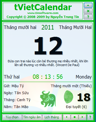 tVietCalendar 1.3.1 của tác giả Nguyễn Trung Tín là tiện ích Lịch âm dương không cần cài đặt (chạy trực tiếp từ file tVietCalendar.exe).